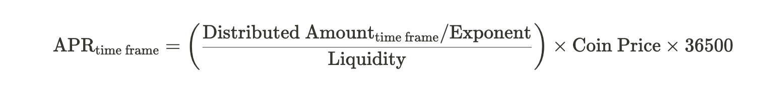 Distribured Amount_timeframeis the sum of distributed rewards for the time frame (1 day, 7 days, or 14 days).Exponentis a factor related to the coin denomination.Liquidityis the total liquidity in USD for the pool, adjusted by the percentage bonded (if applicable).Coin Priceis the current price of the coin.- The multiplier (36500) annualizes the rate.
